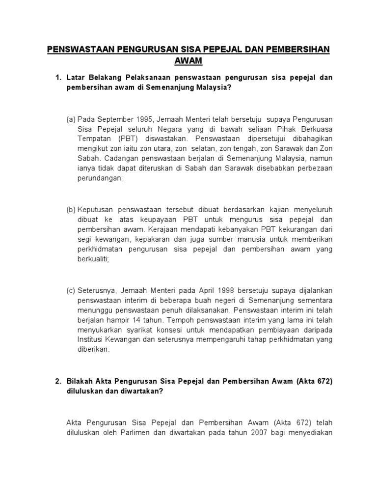 Akta Pengurusan Sisa Pepejal Dan Pembersihan Awam 2007 Akta 672 Pnmb2u