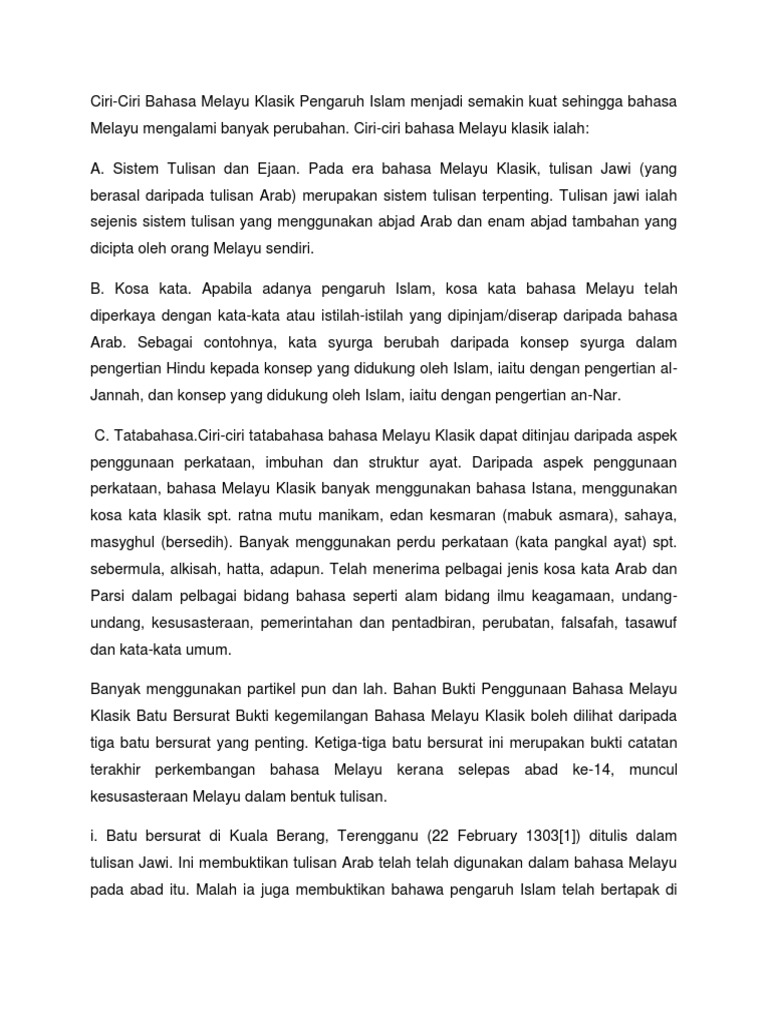 Ciri Ciri Bahasa Melayu Klasik