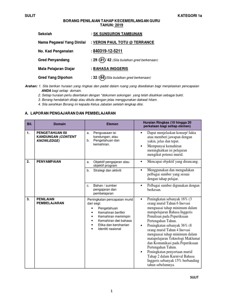 Doc Borang Penilaian Tahap Kecemerlangan Guru Borang Kategori 1b Guru 1 Lismawati Jamaludin Academia Edu