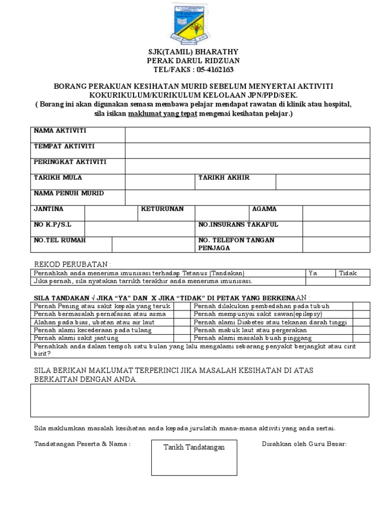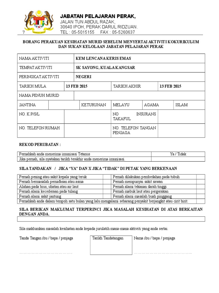 Surat Akuan Kebenaran Ibu Bapa Penjaga Lampiran 2 Borang Perakuan Kesihatan Murid Sebelum Menyertai Aktiviti Kokurikulum Luar Nama Aktiviti Tempat Aktiviti Peringkat Aktiviti Tarikh