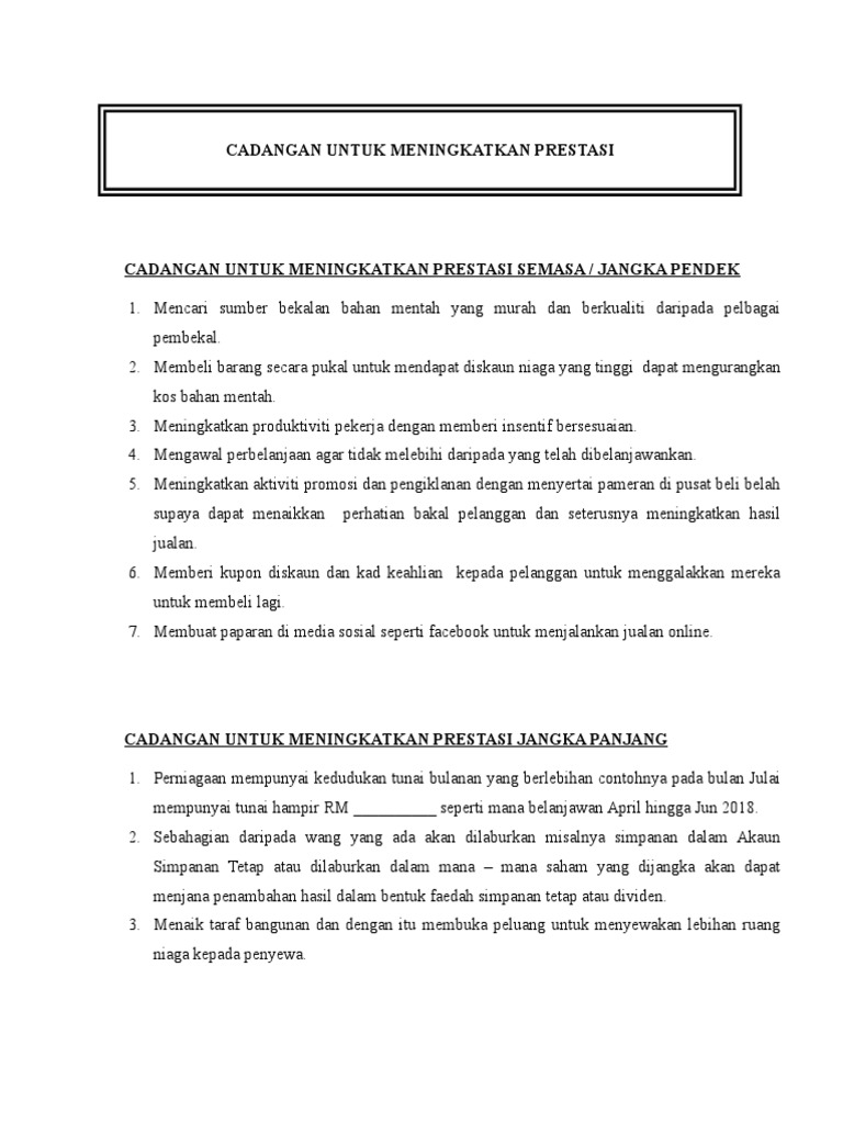 82 84 82 menganggap dokumen ini bermanfaat 84 suara 85k tayangan 2 halaman. Simpan simpan 16 cadangan untuk meningkatkan prestasi untuk nanti. Selain itu untuk memastikan sesebuah perniagaan itu berjaya kita juga perlu mempunyai strategi yang berkesan.
