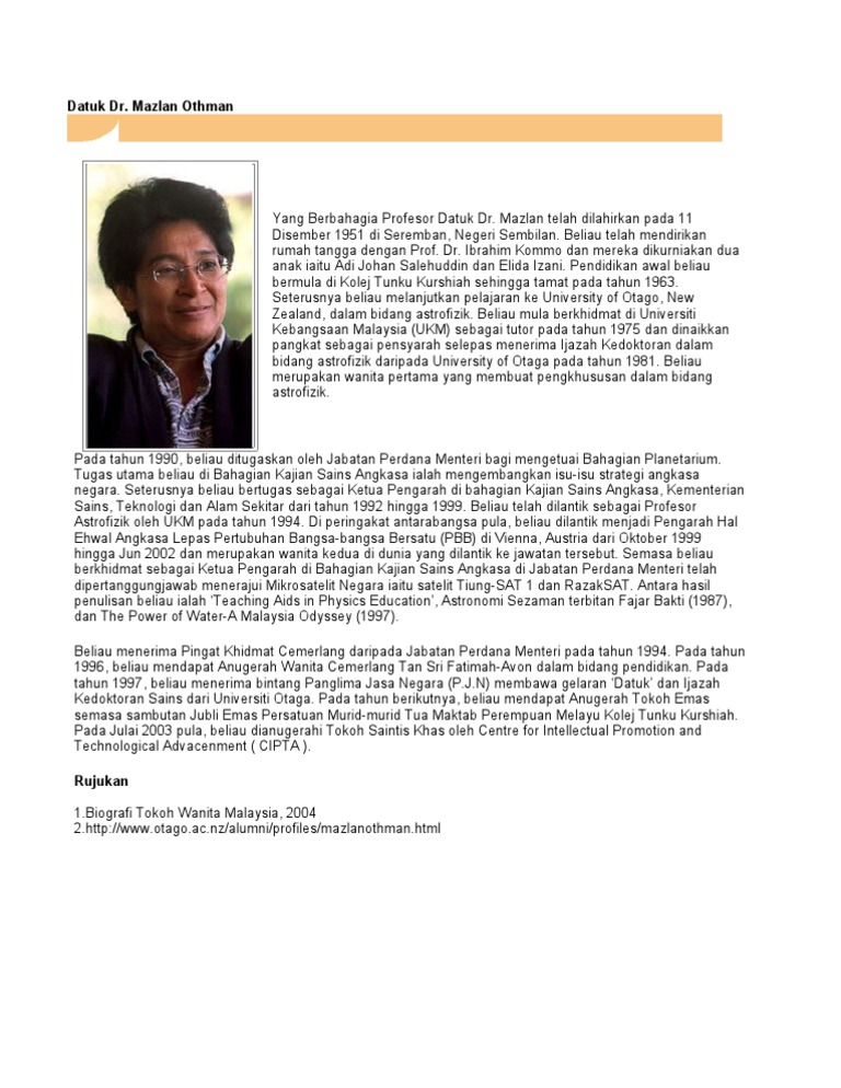 Pusat Kajian Kecemerlangan Melayu Ikon Minggu Ini Profesor Datuk Dr Mazlan Othman Professor Datuk Dr Mazlan Othman Merupakan Seorang Pakar Astrofizik Wanita Pertama Di Malaysia Nama Beliau Terkenal Dalam Bidang