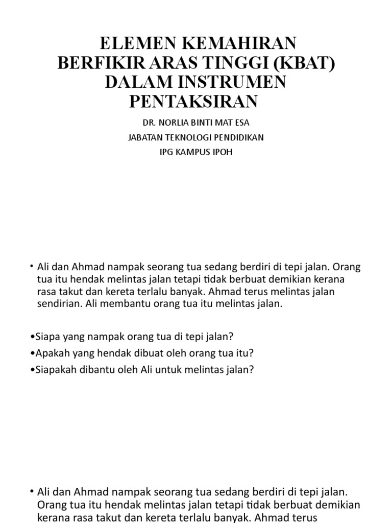 Elemen kbat dalam pentaksiran 2014 6. 2 1 elemen kbat dalam kurikulum 2 1 1 mengenal pasti kbat dalam dokumen kurikulum kbat ditulis secara eksplisit dalam dokumen kurikulum iaitu dokumen standard kurikulum dan pentaksiran dskp bagi kurikulum bersepadu sekolah menengah kssm. Elemen kemahiran berfikir aras tinggi kbat di dalam amalan pengajaran guru pendidikan islam menurut imam ghazali elements of higher order thinking skills hots in teachers practice in teaching islamic education according to imam ghazali mohd syaubari bin othman1 ahmad yunus bin kassim2 abstrak.